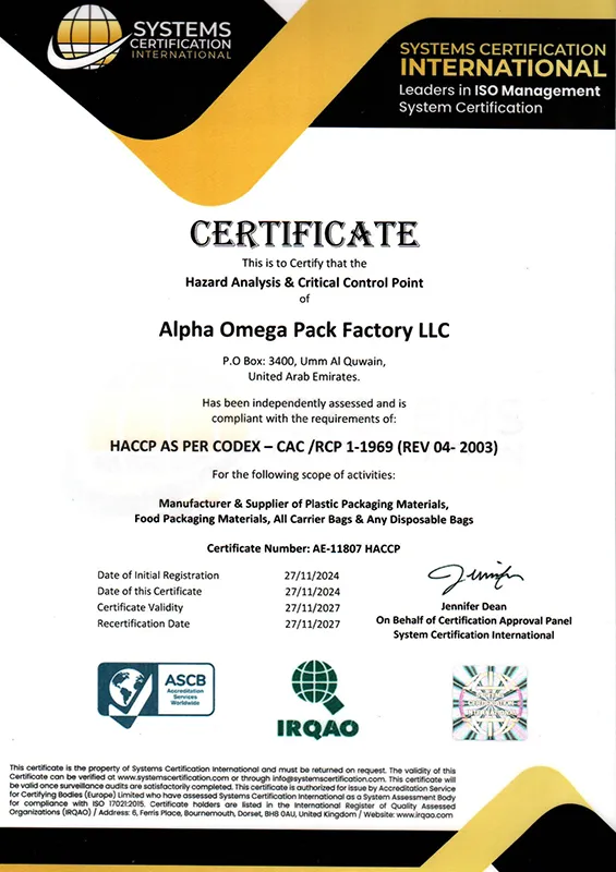 ISO 9001:2015, ISO 14001:2015, and ISO 45001:2018. ECAS Oxo-biodegradable by ESMA complying with UAE Standard S. 5009:2009; certified to the HACCP CAC/RCP 1-1969 standard
